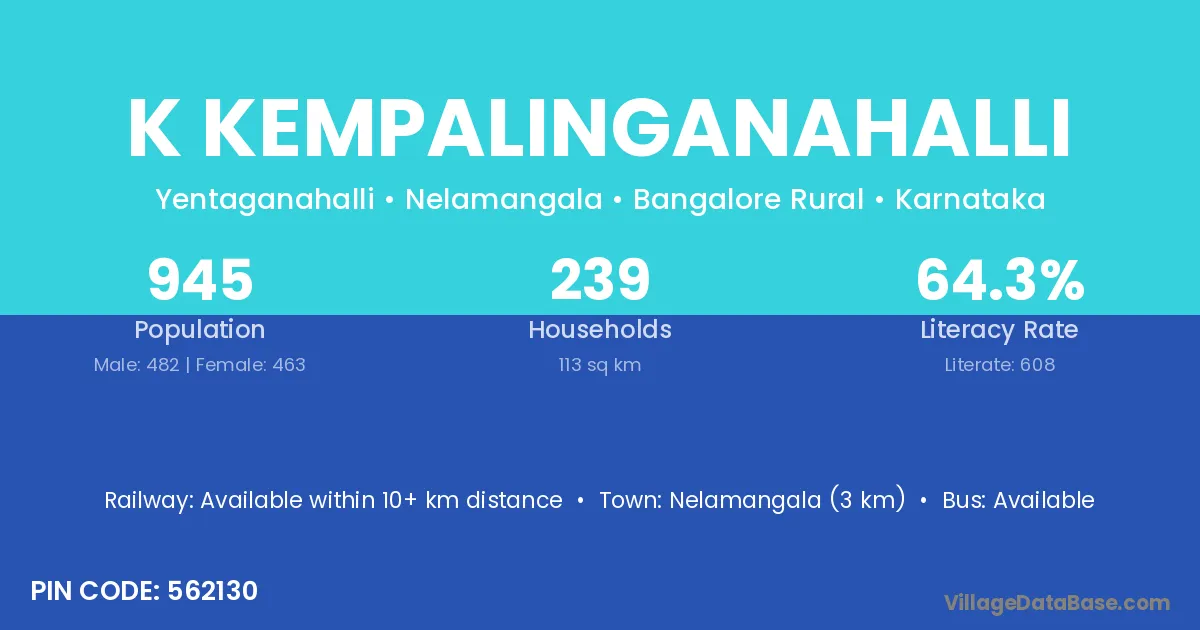 Nelamangala (3 km) is the nearest town to K Kempalinganahalli village for major economic activities and is located approximately 3 km away.