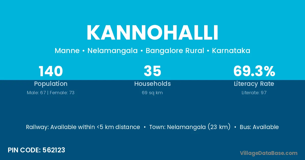 Nelamangala (23 km) is the nearest town to Kannohalli village for major economic activities and is located approximately 23 km away.