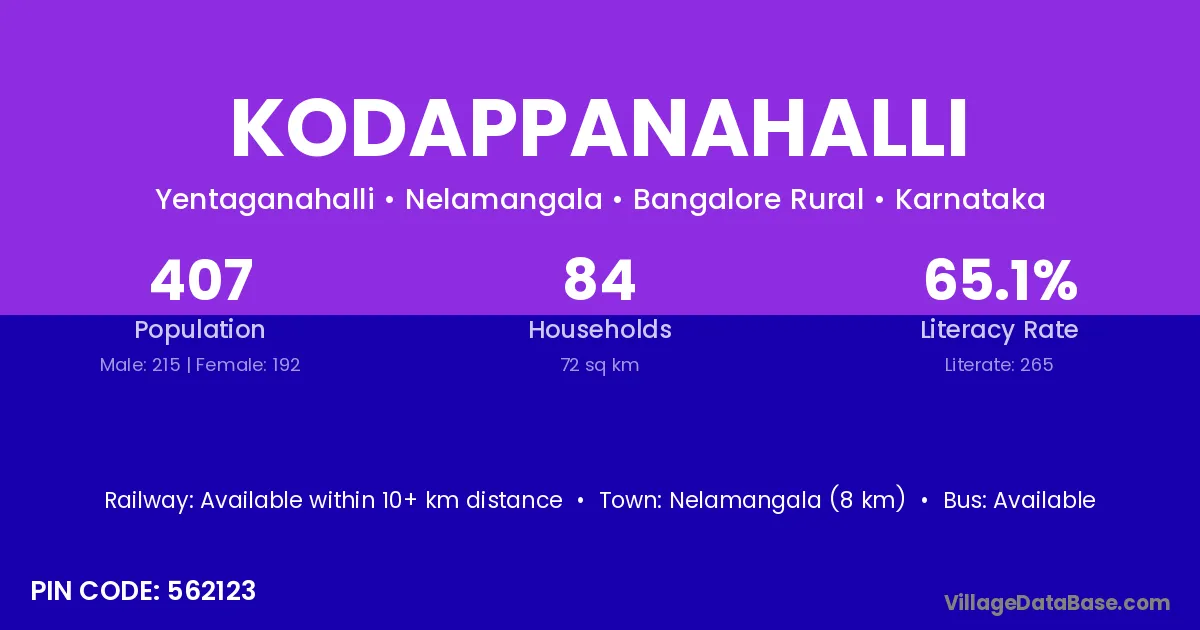 Nelamangala (8 km) is the nearest town to Kodappanahalli village for major economic activities and is located approximately 8 km away.