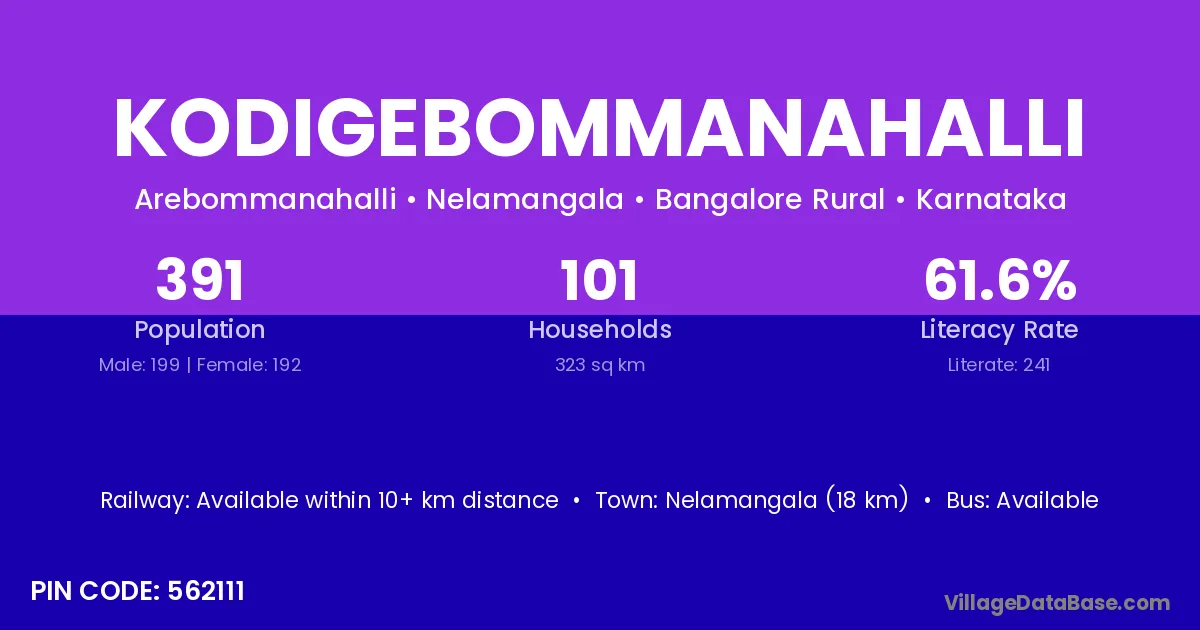 Nelamangala (18 km) is the nearest town to Kodigebommanahalli village for major economic activities and is located approximately 18 km away.