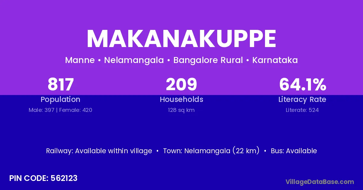 Nelamangala (22 km) is the nearest town to Makanakuppe village for major economic activities and is located approximately 22 km away.