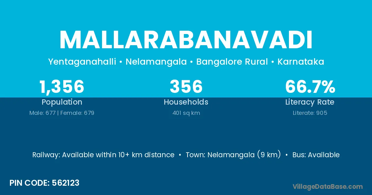 Nelamangala (9 km) is the nearest town to Mallarabanavadi village for major economic activities and is located approximately 9 km away.
