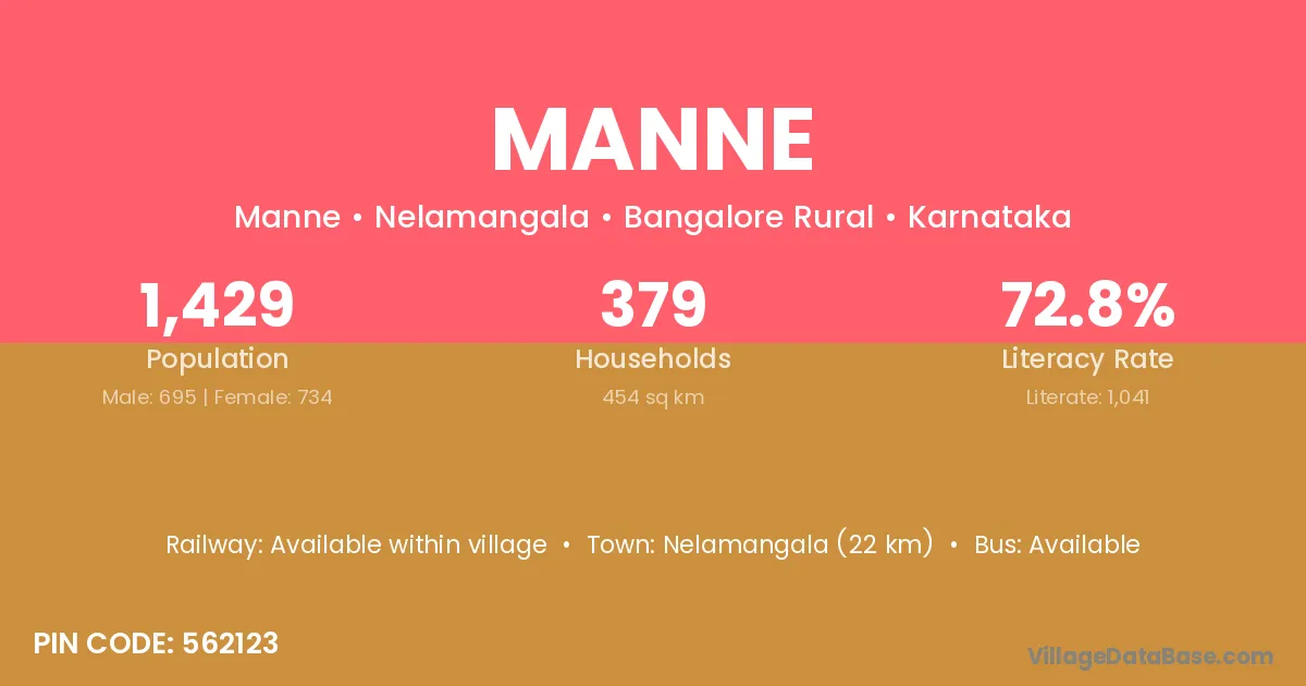 Nelamangala (22 km) is the nearest town to Manne village for major economic activities and is located approximately 22 km away.