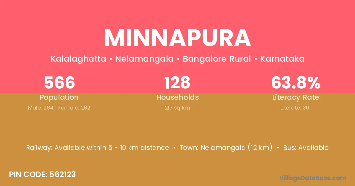 Nelamangala (12 km) is the nearest town to Minnapura village for major economic activities and is located approximately 12 km away.