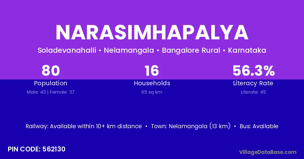 Nelamangala (13 km) is the nearest town to Narasimhapalya village for major economic activities and is located approximately 13 km away.