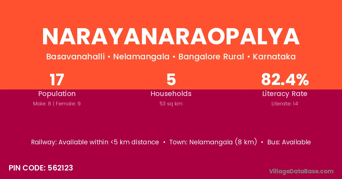 Narayanaraopalya village has a total population of 17 people, of which 8 are males and 9 are females.