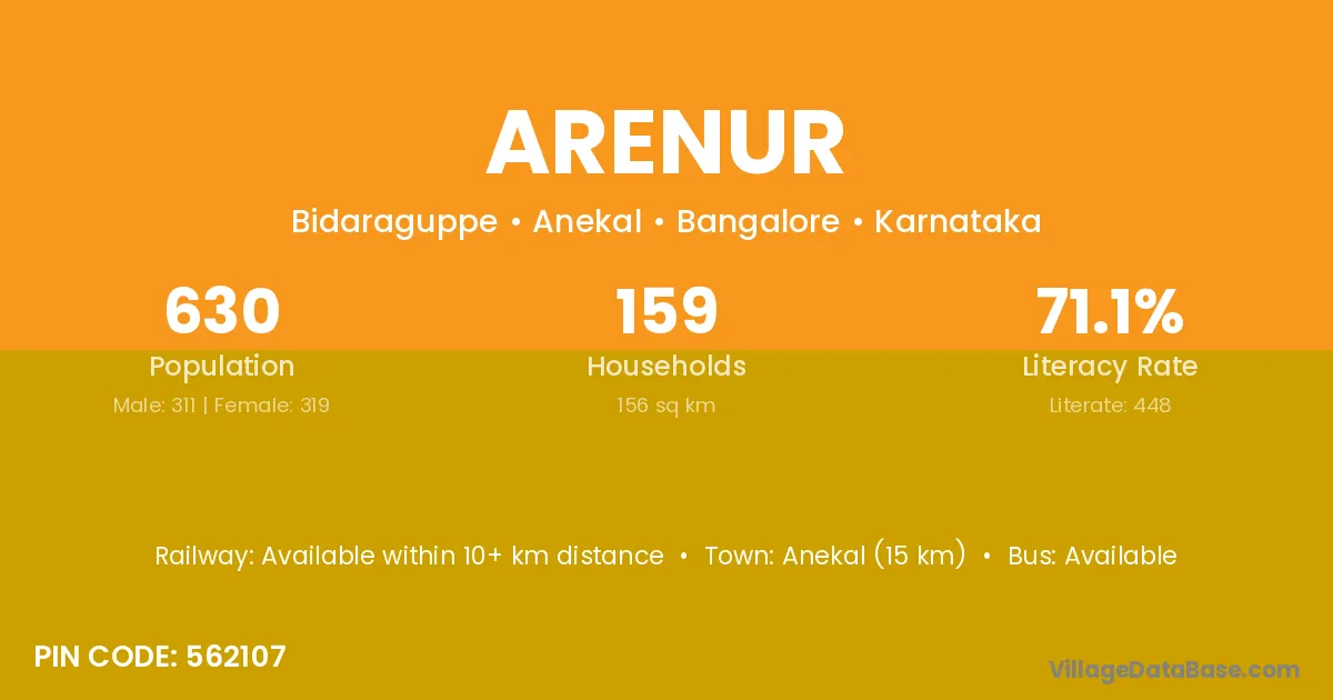 Anekal (15 km) is the nearest town to Arenur village for major economic activities and is located approximately 15 km away.