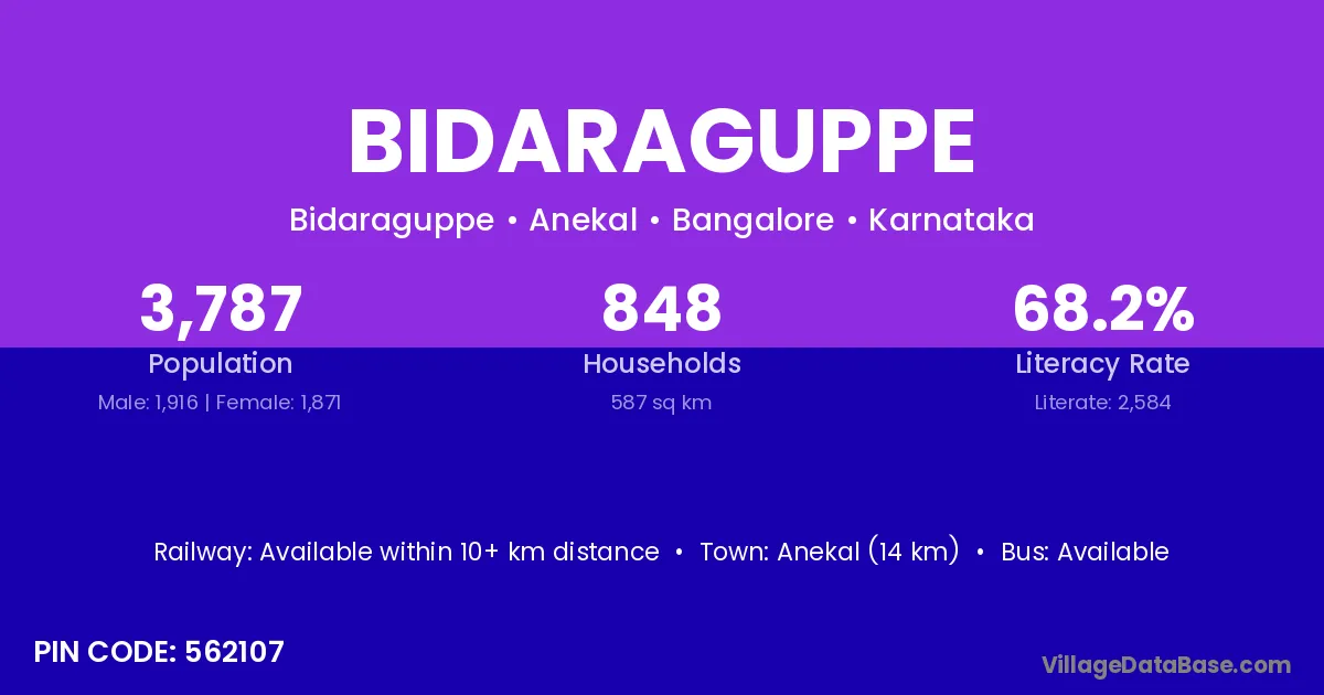 Anekal (14 km) is the nearest town to Bidaraguppe village for major economic activities and is located approximately 14 km away.