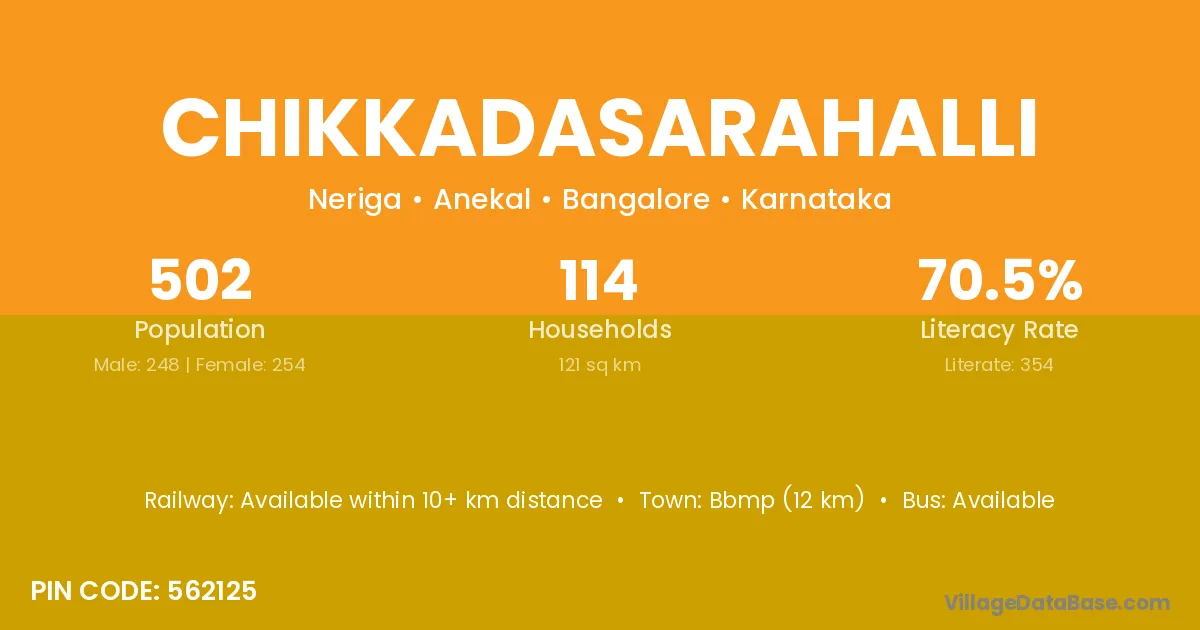 Bbmp (12 km) is the nearest town to Chikkadasarahalli village for major economic activities and is located approximately 12 km away.