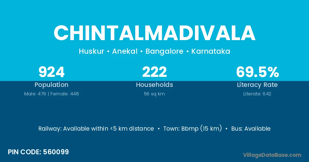 Bbmp (15 km) is the nearest town to Chintalmadivala village for major economic activities and is located approximately 15 km away.