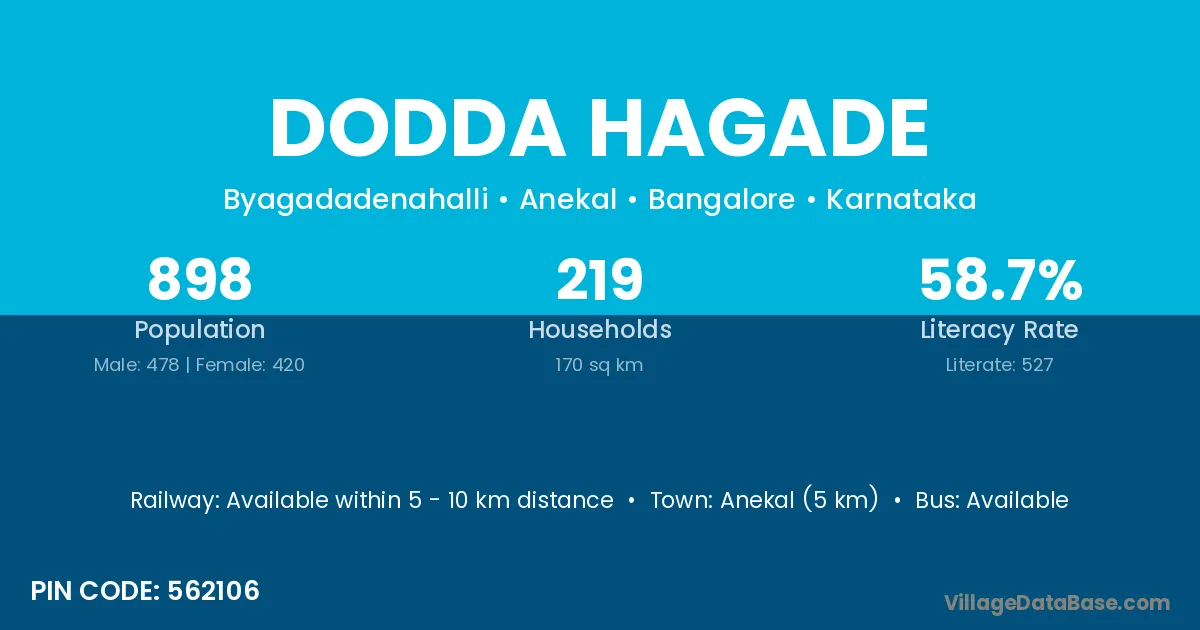 Anekal (5 km) is the nearest town to Dodda Hagade village for major economic activities and is located approximately 5 km away.