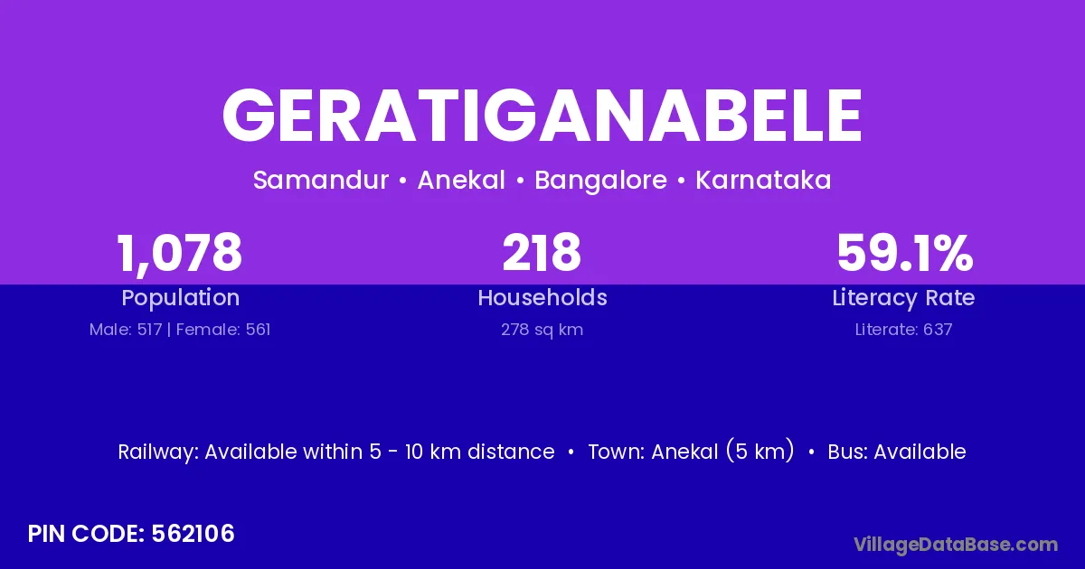 Anekal (5 km) is the nearest town to Geratiganabele village for major economic activities and is located approximately 5 km away.