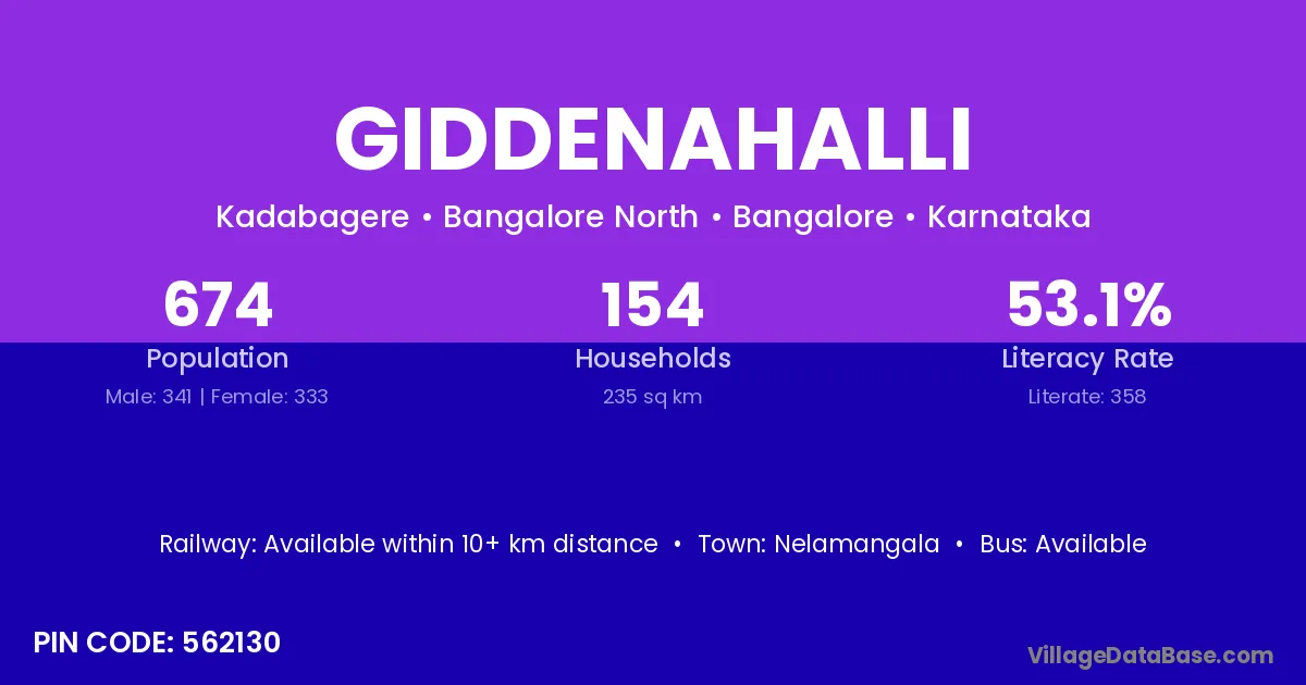 The literacy rate of Giddenahalli village is 63.68%. Male literacy stands at 69.82% and female literacy at 56.54%.