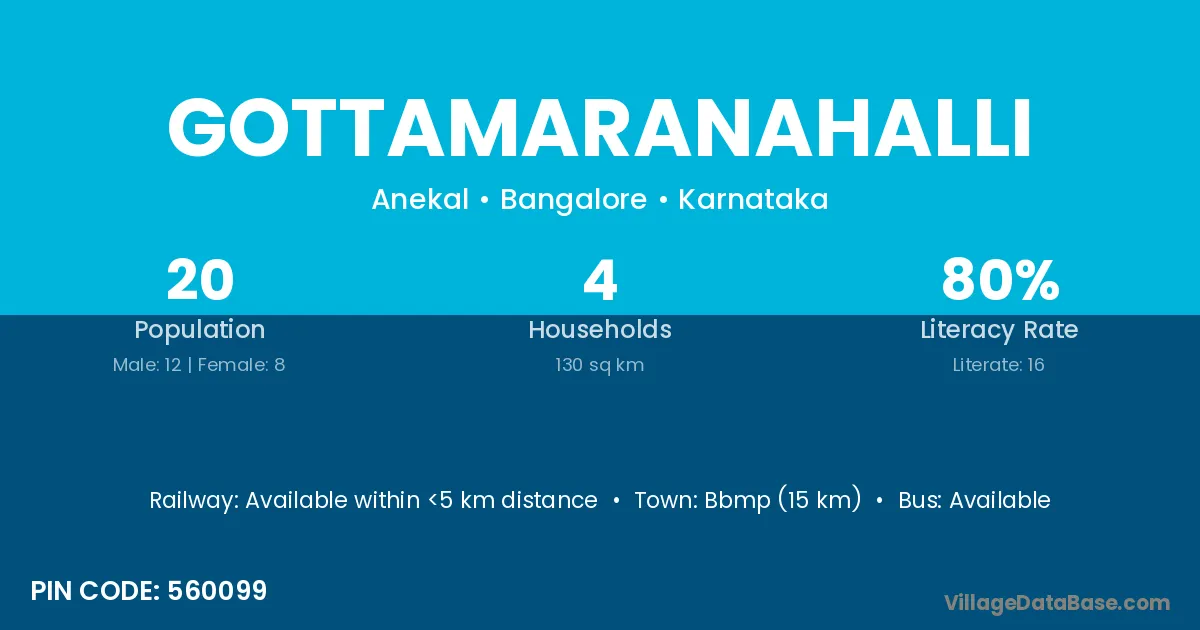 Bbmp (15 km) is the nearest town to Gottamaranahalli village for major economic activities and is located approximately 15 km away.