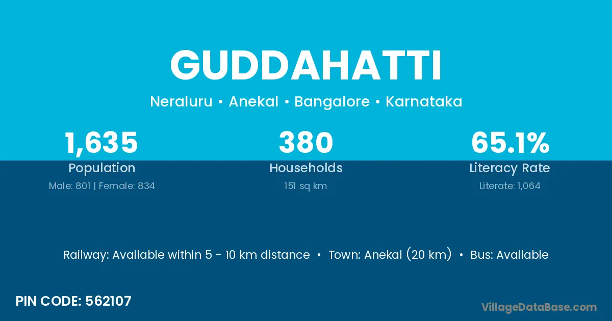 Anekal (20 km) is the nearest town to Guddahatti village for major economic activities and is located approximately 20 km away.