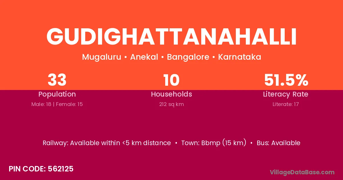 Bbmp (15 km) is the nearest town to Gudighattanahalli village for major economic activities and is located approximately 15 km away.