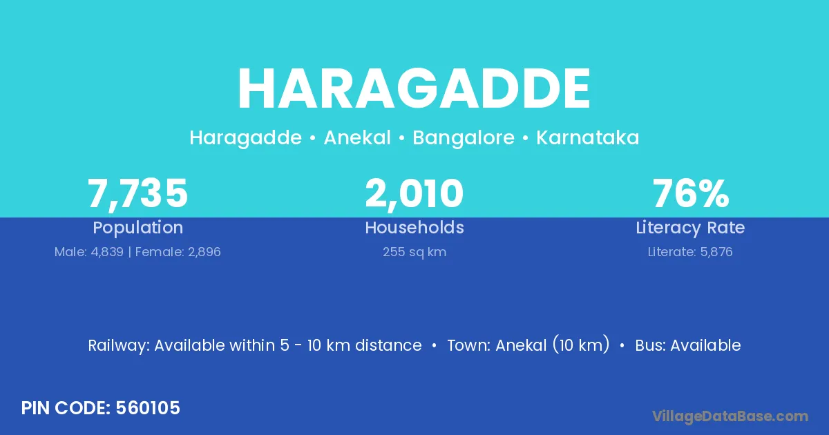 Anekal (10 km) is the nearest town to Haragadde village for major economic activities and is located approximately 10 km away.