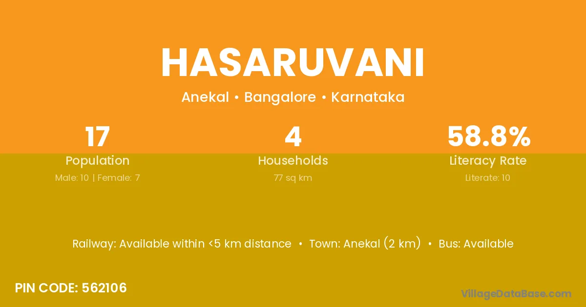 Anekal (2 km) is the nearest town to Hasaruvani village for major economic activities and is located approximately 2 km away.