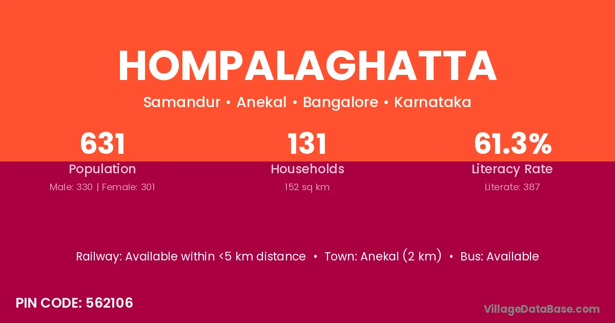 Anekal (2 km) is the nearest town to Hompalaghatta village for major economic activities and is located approximately 2 km away.