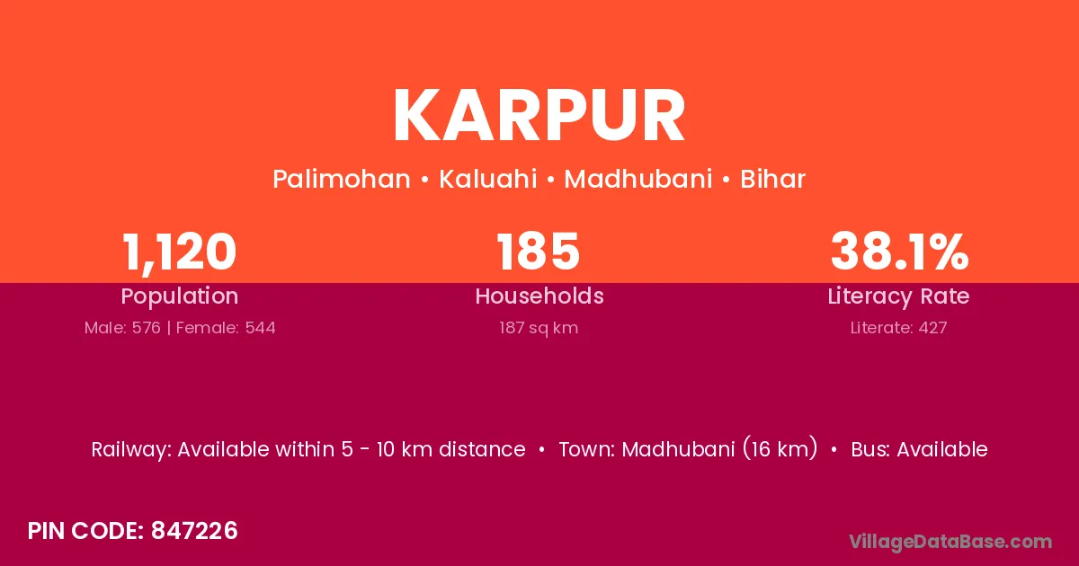 Karpur village has a total population of 2,026 people, of which 1,047 are males and 979 are females.
