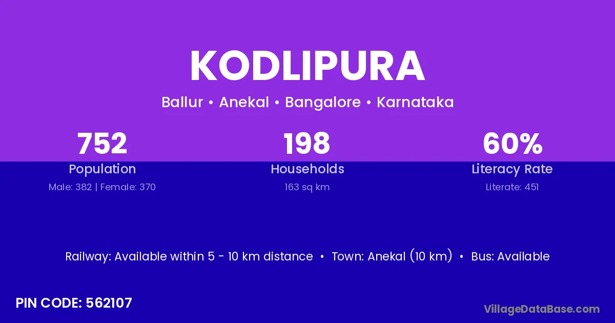 Anekal (10 km) is the nearest town to Kodlipura village for major economic activities and is located approximately 10 km away.