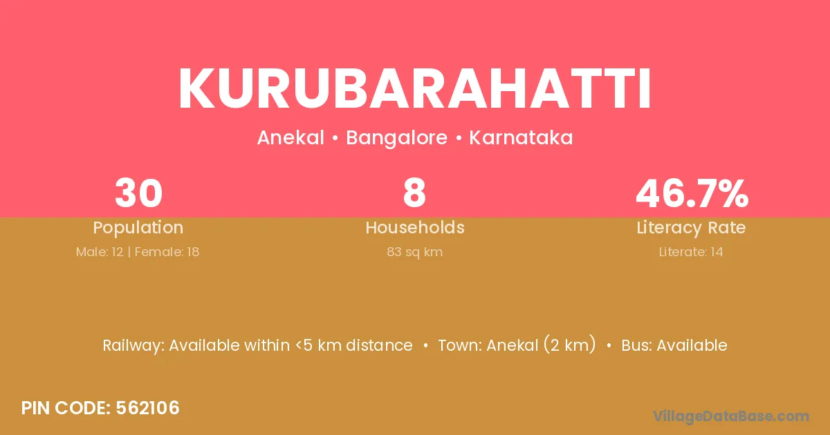 Anekal (2 km) is the nearest town to Kurubarahatti village for major economic activities and is located approximately 2 km away.
