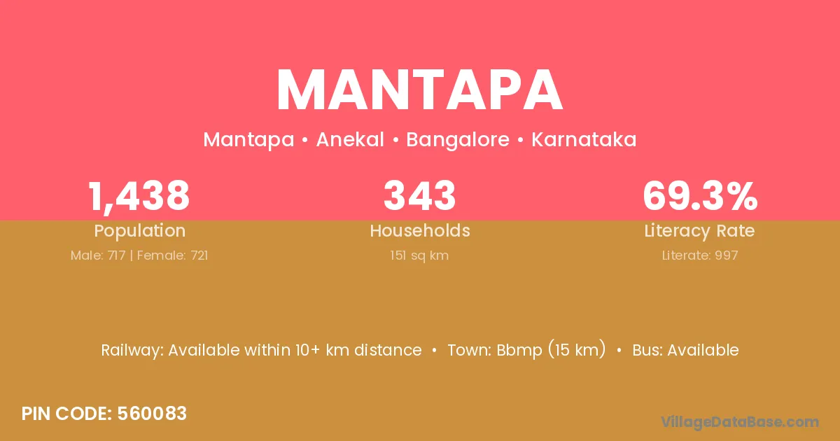 Bbmp (15 km) is the nearest town to Mantapa village for major economic activities and is located approximately 15 km away.