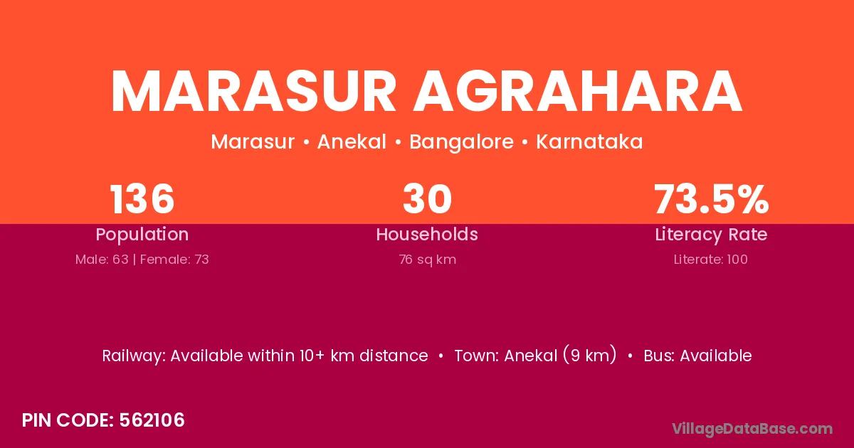 Marasur Agrahara village has a total population of 136 people, of which 63 are males and 73 are females.