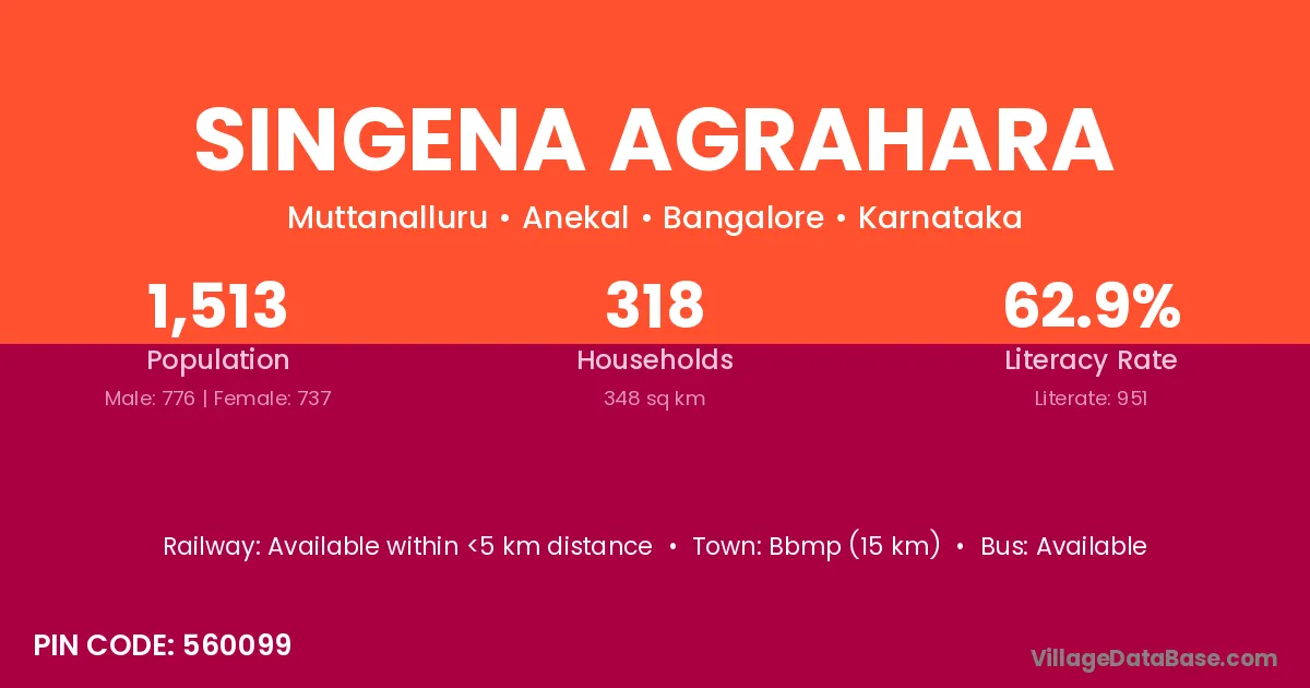 Bbmp (15 km) is the nearest town to Singena Agrahara village for major economic activities and is located approximately 15 km away.