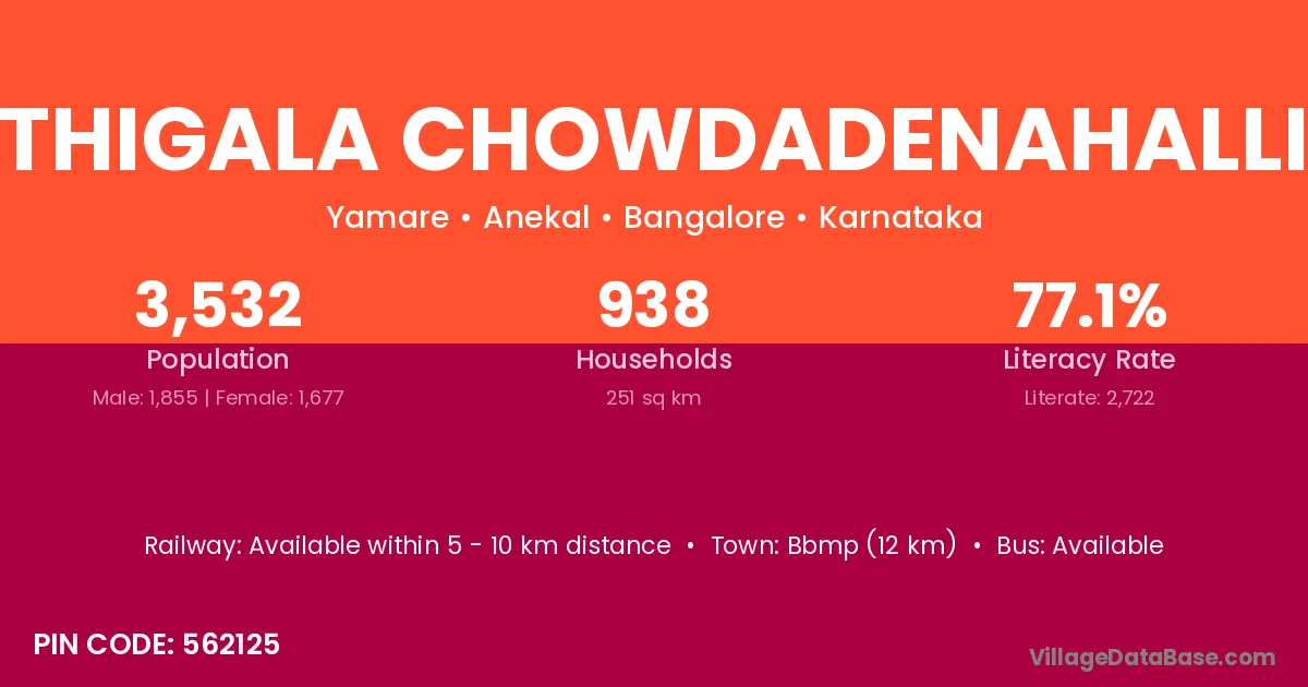 Bbmp (12 km) is the nearest town to Thigala Chowdadenahalli village for major economic activities and is located approximately 12 km away.