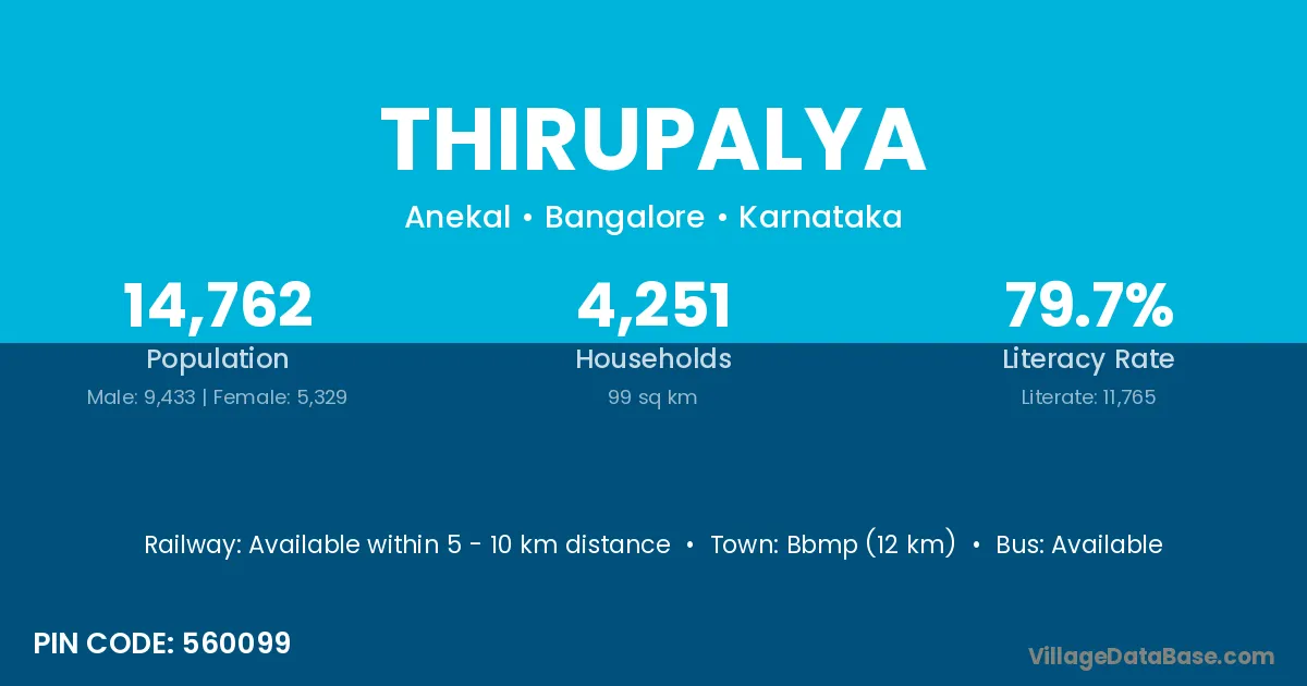 Bbmp (12 km) is the nearest town to Thirupalya village for major economic activities and is located approximately 12 km away.