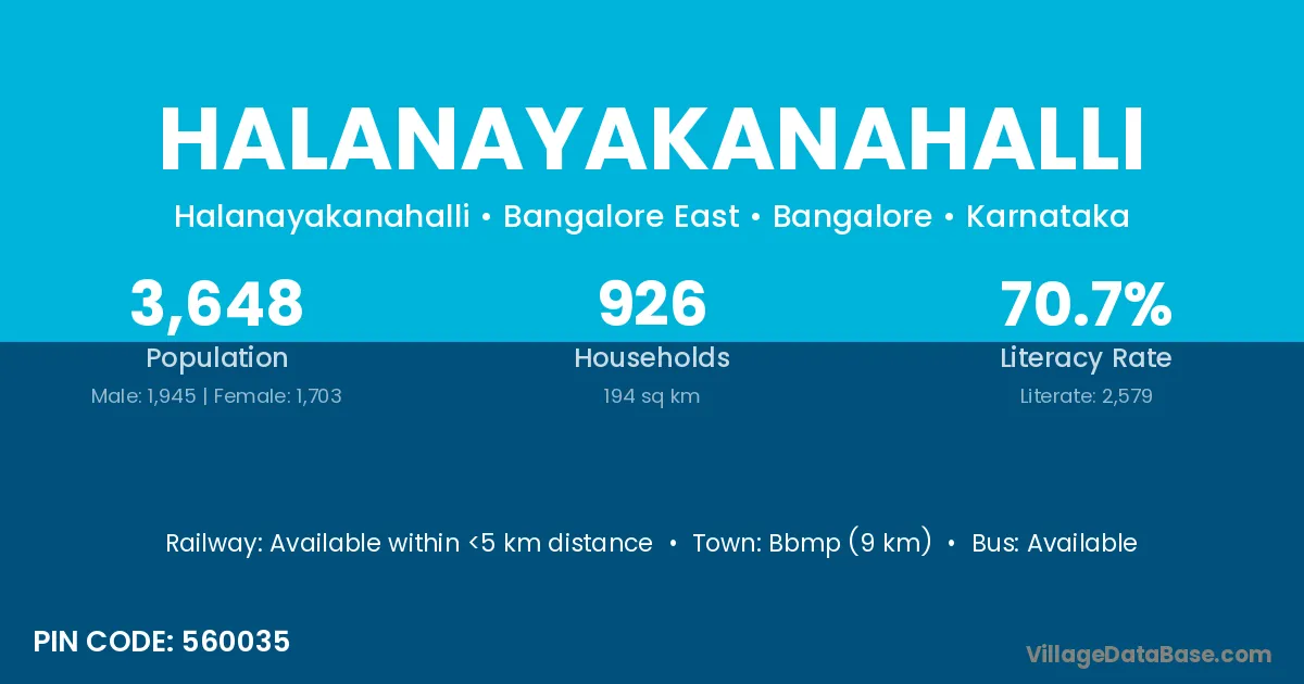 Bbmp (9 km) is the nearest town to Halanayakanahalli village for major economic activities and is located approximately 9 km away.