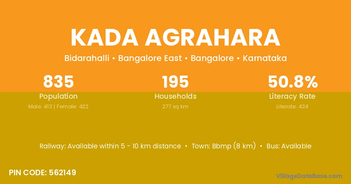 Bbmp (8 km) is the nearest town to Kada Agrahara village for major economic activities and is located approximately 8 km away.