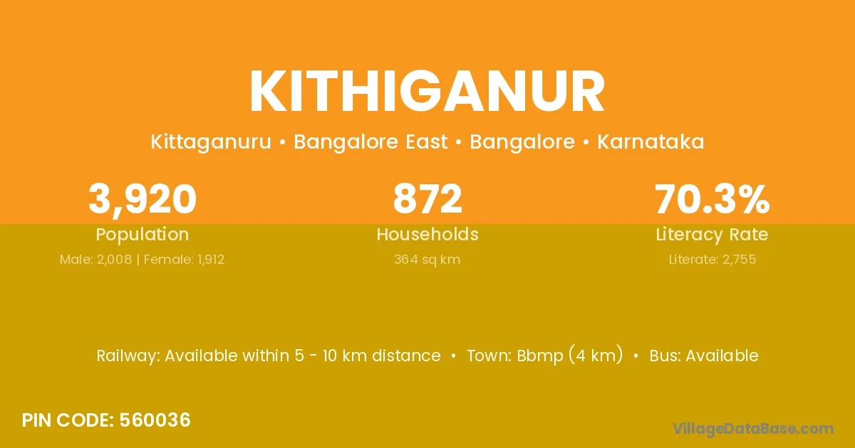 Bbmp (4 km) is the nearest town to Kithiganur village for major economic activities and is located approximately 4 km away.