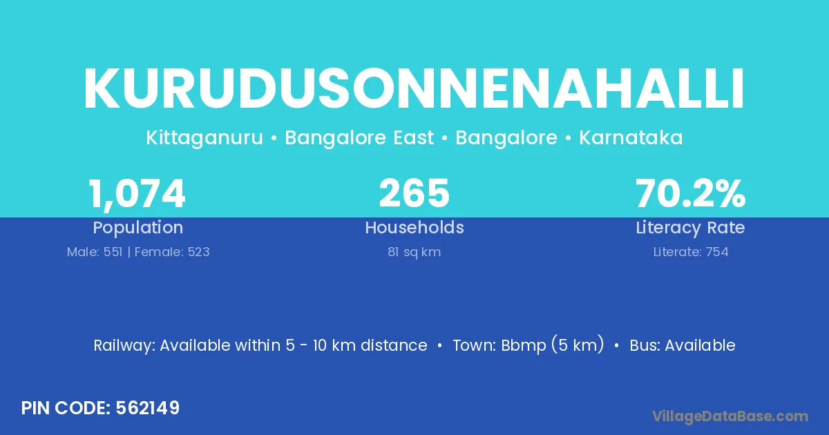 Kurudusonnenahalli village has a total population of 1,074 people, of which 551 are males and 523 are females.