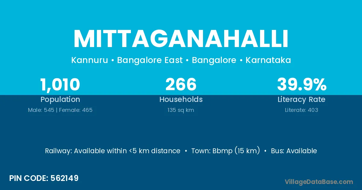 Bbmp (15 km) is the nearest town to Mittaganahalli village for major economic activities and is located approximately 15 km away.