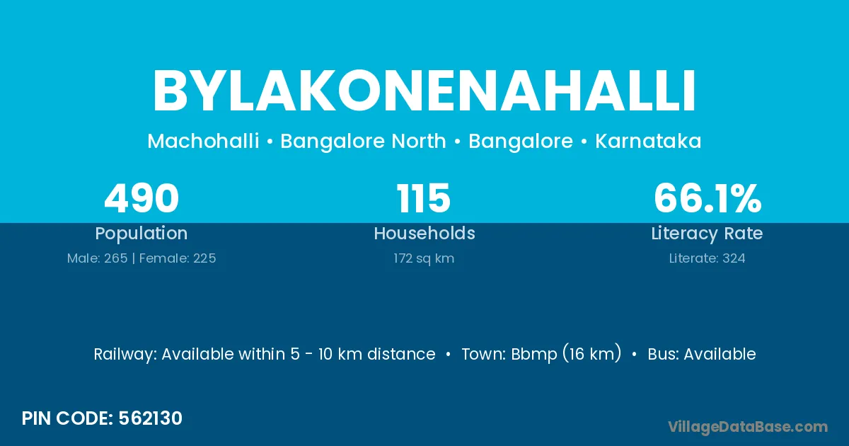 Bbmp (16 km) is the nearest town to Bylakonenahalli village for major economic activities and is located approximately 16 km away.