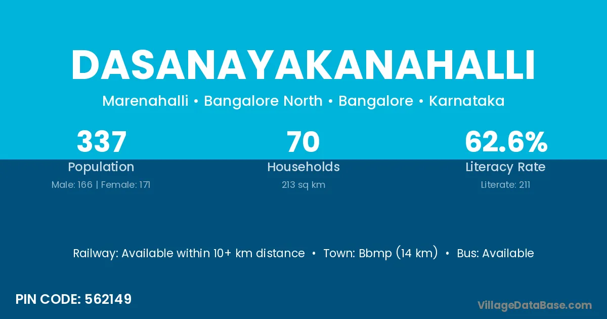 Bbmp (14 km) is the nearest town to Dasanayakanahalli village for major economic activities and is located approximately 14 km away.