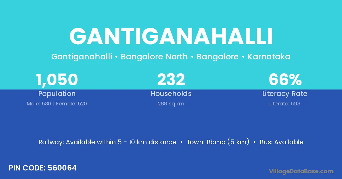 Gantiganahalli village has a total population of 1,050 people, of which 530 are males and 520 are females.