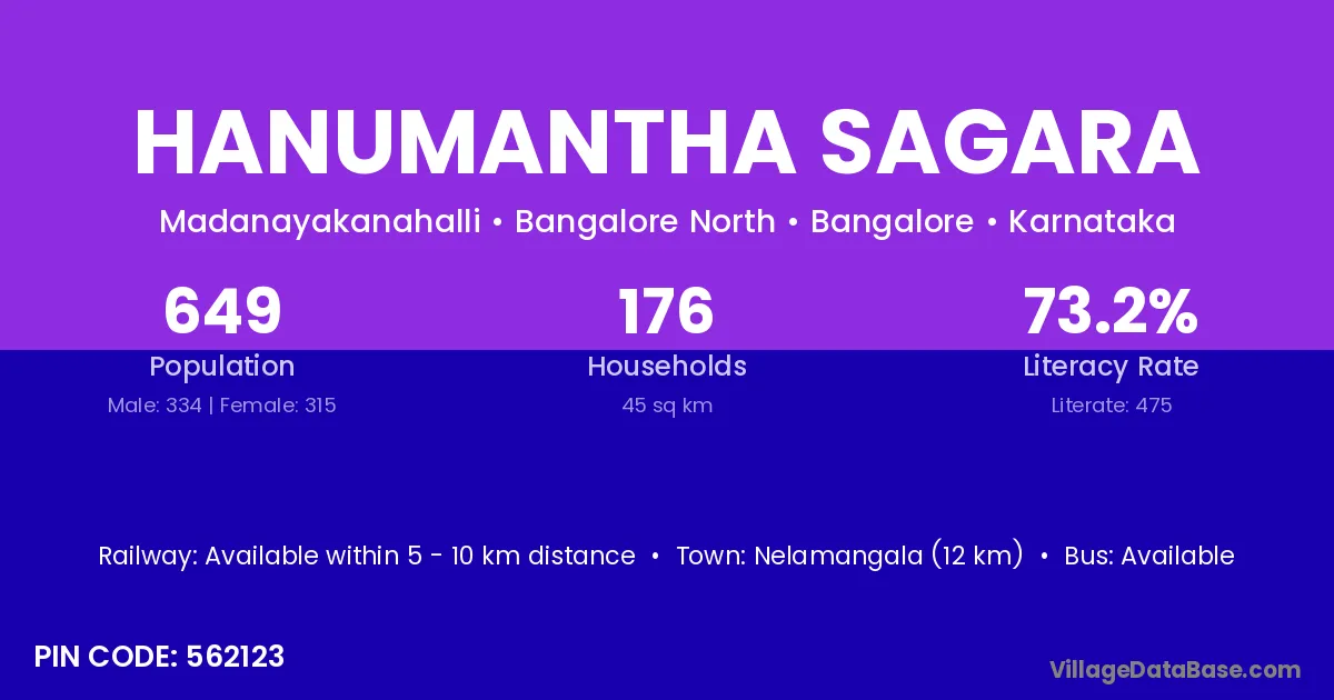 Nelamangala (12 km) is the nearest town to Hanumantha Sagara village for major economic activities and is located approximately 12 km away.