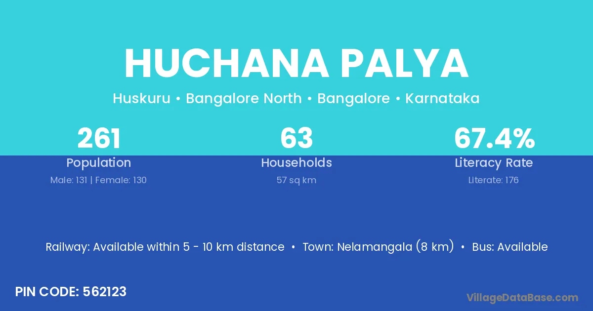 Nelamangala (8 km) is the nearest town to Huchana Palya village for major economic activities and is located approximately 8 km away.