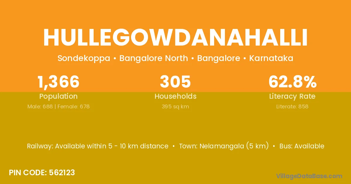 Nelamangala (5 km) is the nearest town to Hullegowdanahalli village for major economic activities and is located approximately 5 km away.