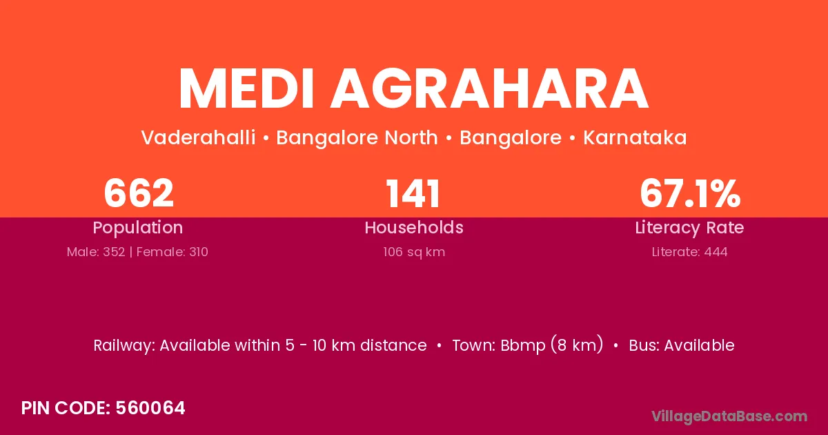 Bbmp (8 km) is the nearest town to Medi Agrahara village for major economic activities and is located approximately 8 km away.