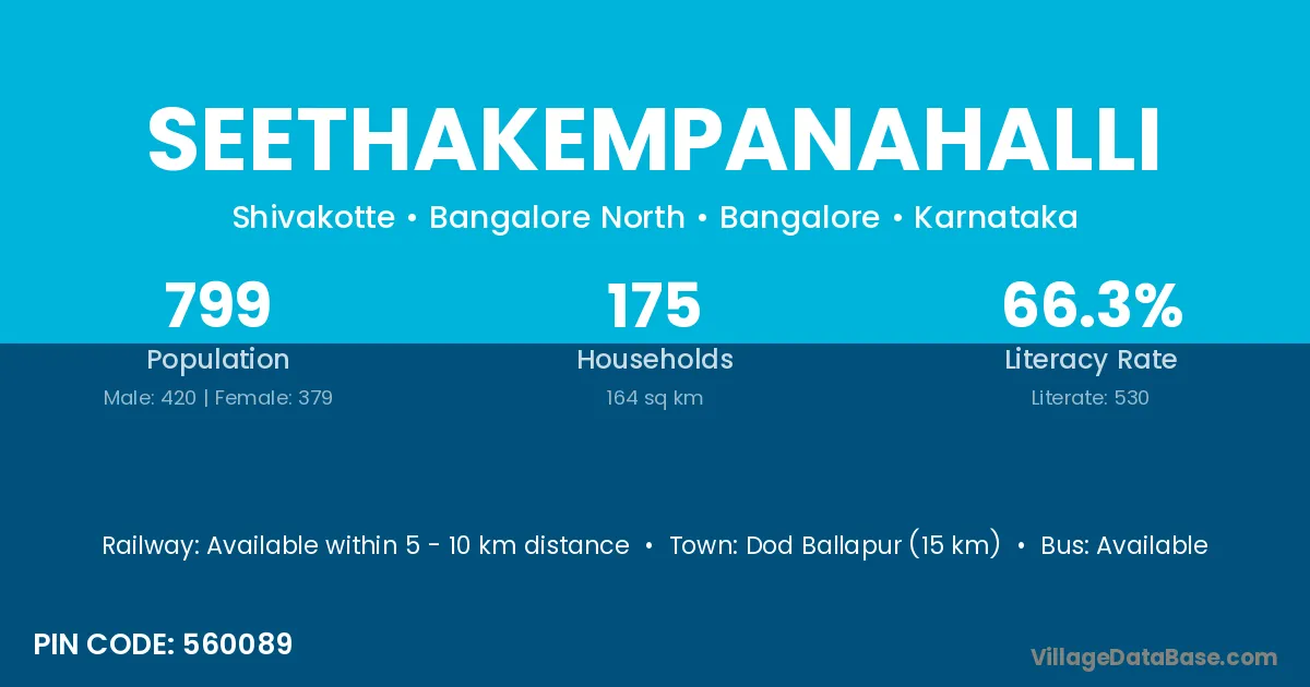 Dod Ballapur (15 km) is the nearest town to Seethakempanahalli village for major economic activities and is located approximately 15 km away.