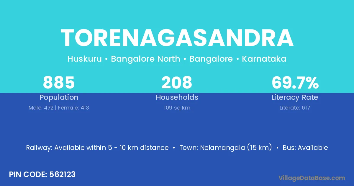 Nelamangala (15 km) is the nearest town to Torenagasandra village for major economic activities and is located approximately 15 km away.