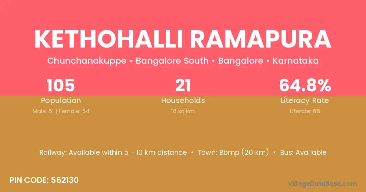 Kethohalli Ramapura village has a total population of 105 people, of which 51 are males and 54 are females.