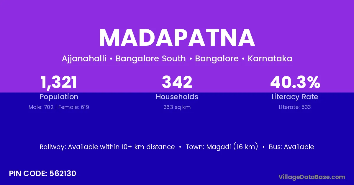 Magadi (16 km) is the nearest town to Madapatna village for major economic activities and is located approximately 16 km away.