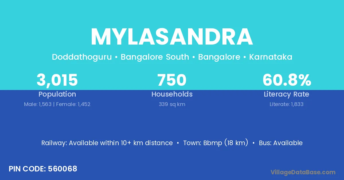Bbmp (18 km) is the nearest town to Mylasandra village for major economic activities and is located approximately 18 km away.