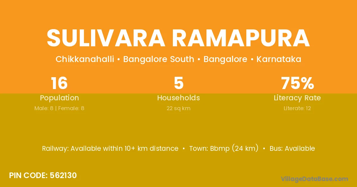 Bbmp (24 km) is the nearest town to Sulivara Ramapura village for major economic activities and is located approximately 24 km away.