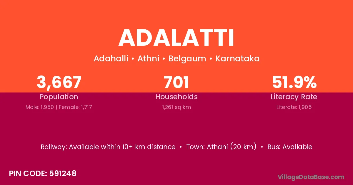 Athani (20 km) is the nearest town to Adalatti village for major economic activities and is located approximately 20 km away.